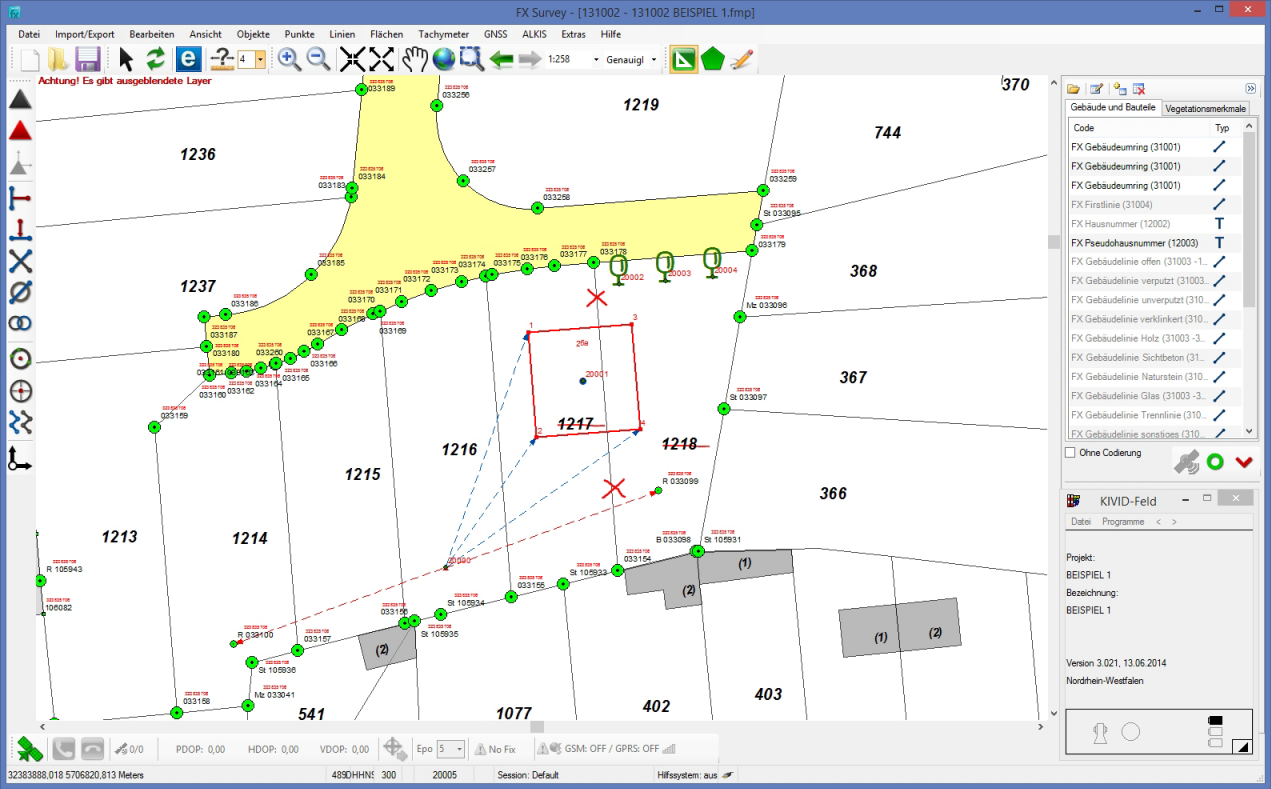Sollten Sie wiederum mehr als „nur” ALKIS®- Punktdaten aufnehmen wollen, helfen Ihnen frei konfigurierbare Codelisten bei der schnellen Erfassung von Punkt-, Linien- und Flächenobjekten, welche mit beliebigen Sachattributen versehen werden können. Nach der Vermessung binden Sie den KIVID®-Feld Stapel mit den originären Mess- und Berechnugsansätzen zur Weiterverarbeitung wieder in Ihr KIVID® bzw. KIVID® A³ im Innendienst ein und ergänzen Ihr CAD- / GIS-System um die parallel im Feld erstellten Pläne und Grafiken.