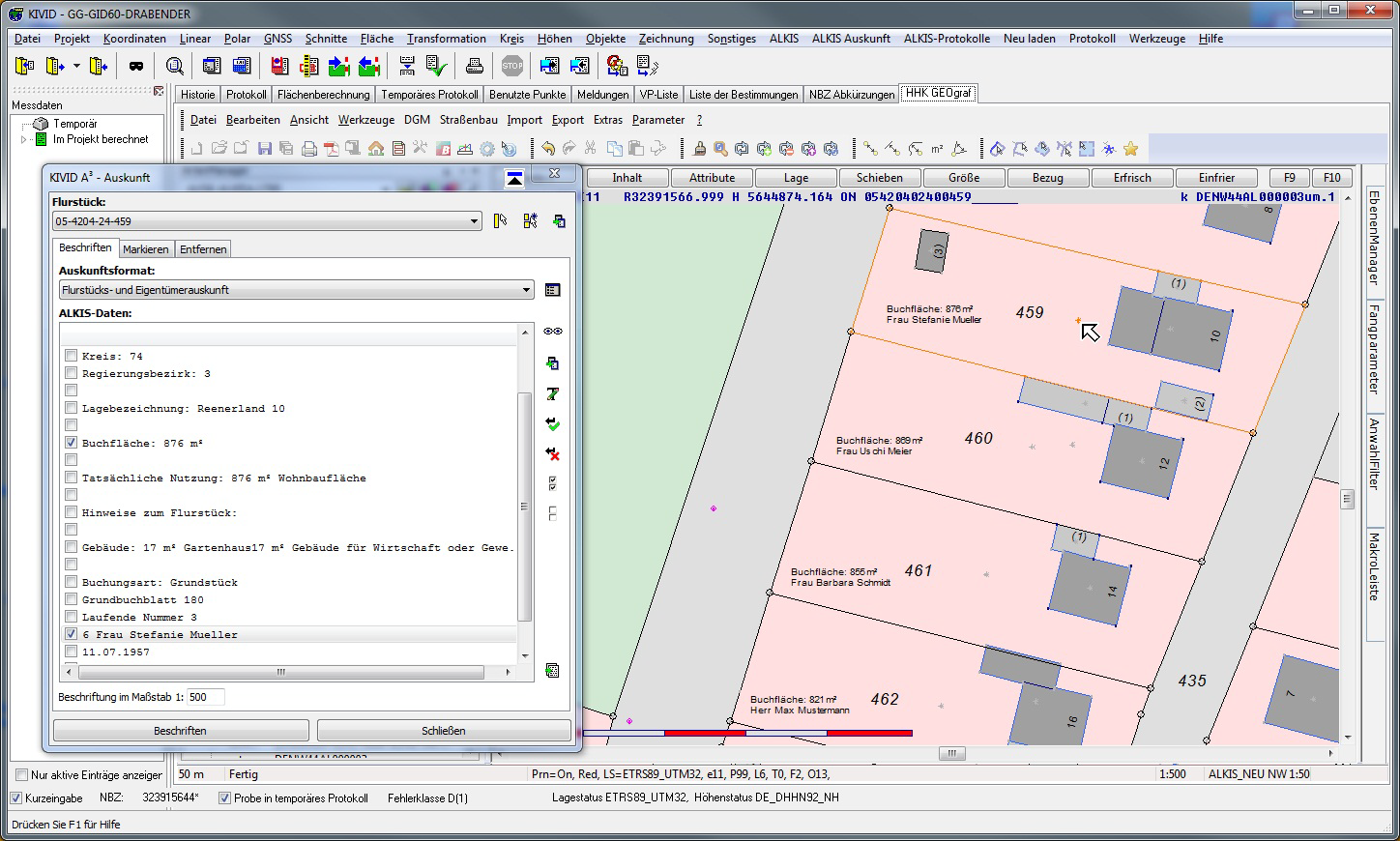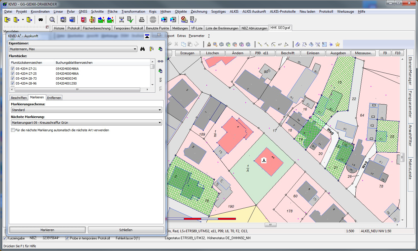 Die KIVID A³®-Auskunftsassistenten führen intelligent und einfach von der Recherche bis zum gewünschten Ergebnis in Form von Listen oder Beschriftungen in der integrierten Grafik. Auch Schraffuren werden unterstützt.